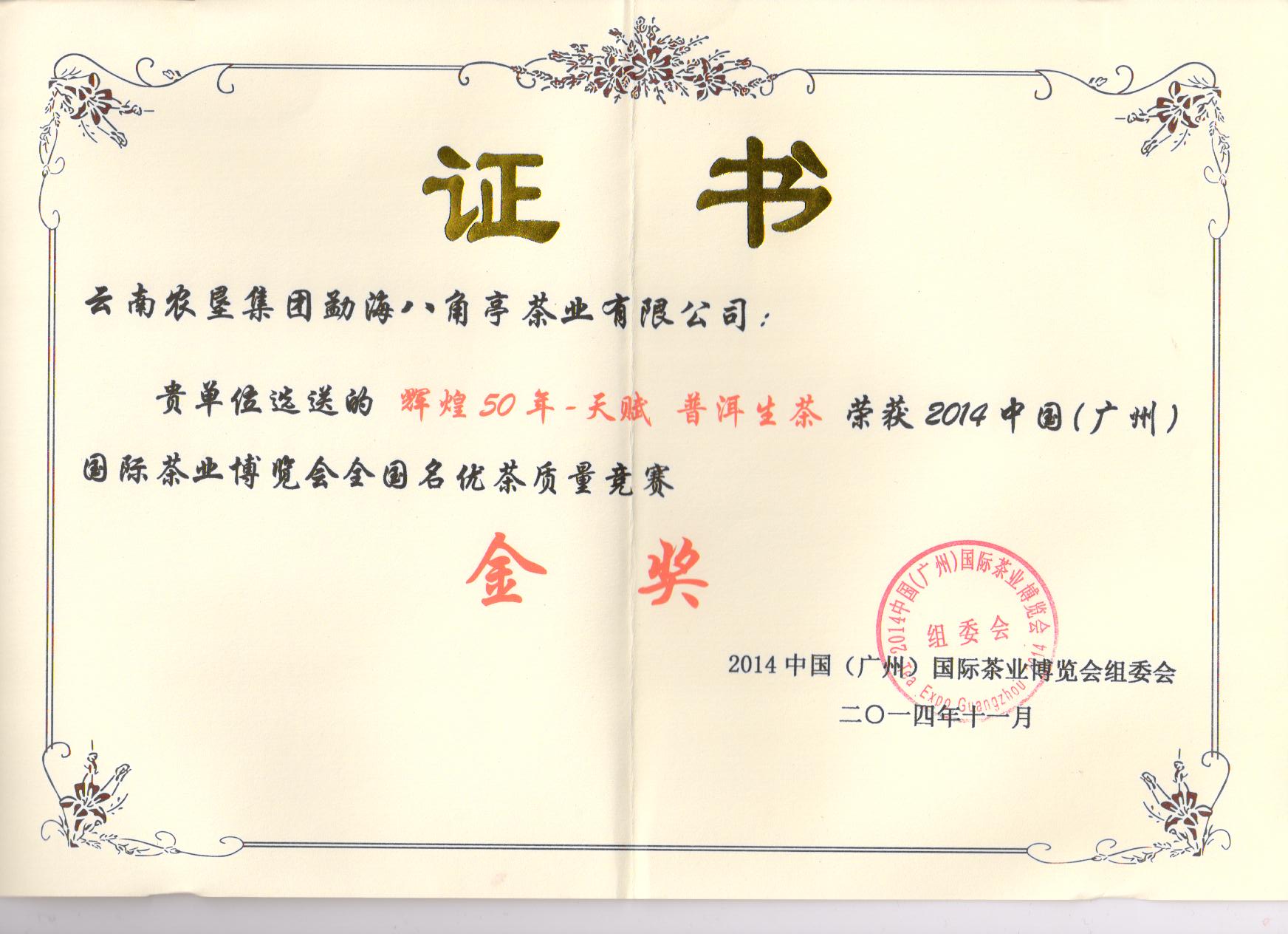 首頁 > 榮譽(yù)資質(zhì) > 2014年廣州茶博會金獎
