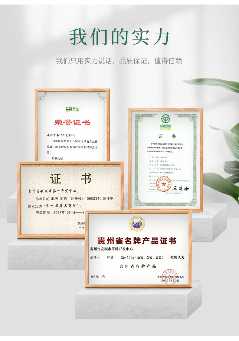 瀑布茶品牌是安順市人民政府主打茶葉品牌,省級(jí)重點(diǎn)打造區(qū)域公共品牌,屬貴州五大名茶,先后獲得獲“中國(guó)農(nóng)產(chǎn)品區(qū)域公用品牌”、“貴州省著名商標(biāo)”、“貴州省名牌產(chǎn)品”等榮譽(yù)稱號(hào)。近年來(lái),在各級(jí)部門大力推動(dòng)下,瀑布茶品牌不斷發(fā)展壯大。截止目前,現(xiàn)有瀑布茶品牌加盟企業(yè)23家,輻射茶園面積200000余畝,其中綠色食品認(rèn)證茶園基地面積7000余畝,有機(jī)食品認(rèn)證基地面積2500畝。擁有“瀑布毛峰”、“瀑布翠芽”、“瀑布紅茶”、“瀑布翠龍”等產(chǎn)品,多次獲得“中綠杯”、“中茶杯”、“華茗杯”等大獎(jiǎng);分別榮獲第14屆中國(guó)國(guó)際農(nóng)產(chǎn)品交易會(huì)金獎(jiǎng)、第18屆中國(guó)綠色食品博覽會(huì)金獎(jiǎng)、“黃山杯”首屆全國(guó)傳統(tǒng)名茶產(chǎn)品質(zhì)量特別金獎(jiǎng)、安順十大旅游商品等殊榮及稱號(hào)。