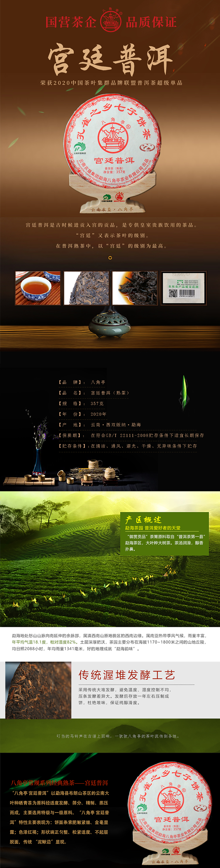 云墾茶業(yè)集團(tuán)下屬茶葉生產(chǎn)企業(yè)——云南農(nóng)墾集團(tuán)勐海八角亭茶業(yè)有限公司原名黎明茶廠,是我國歷史最為悠久的茶企之一,曾位列“中國普洱茶十大知名品牌”“十大最受歡迎茶葉品牌”、“中國普洱茶十大暢銷品牌”中,成為今天市場上最有影響力的品牌之一。公司產(chǎn)品獲得“綠色食品”、ISO9001、 HACCP和云茶品牌(YC)4項(xiàng)認(rèn)證,連續(xù)獲得“云南名牌農(nóng)產(chǎn)品”“云南名牌產(chǎn)品”“云南省著名商標(biāo)”等品牌榮譽(yù),公司生產(chǎn)的多款普洱茶在歷次專業(yè)評比中多次獲得特等金獎(jiǎng)和金獎(jiǎng)。在2018第五屆中國企業(yè)五星品牌論壇上,云南農(nóng)墾集團(tuán)勐海八角亭茶業(yè)有限公司上榜中國普洱茶行業(yè)影響力品牌——“金芽獎(jiǎng)”,公司負(fù)責(zé)人陳勝軍先生獲“陸羽獎(jiǎng)”,被授予2017“國際十大杰出茶人”榮譽(yù)稱號。